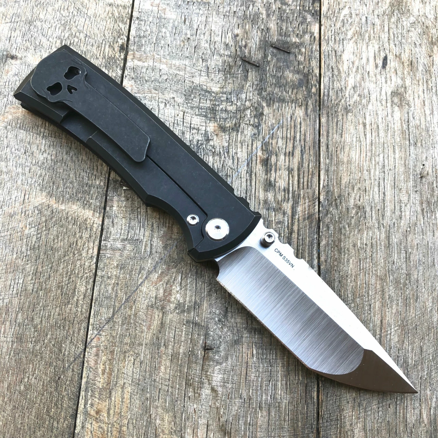 This Redencion Street model has a black G-10 handle with a PVD finished titanium frame and a Satin tanto blade.