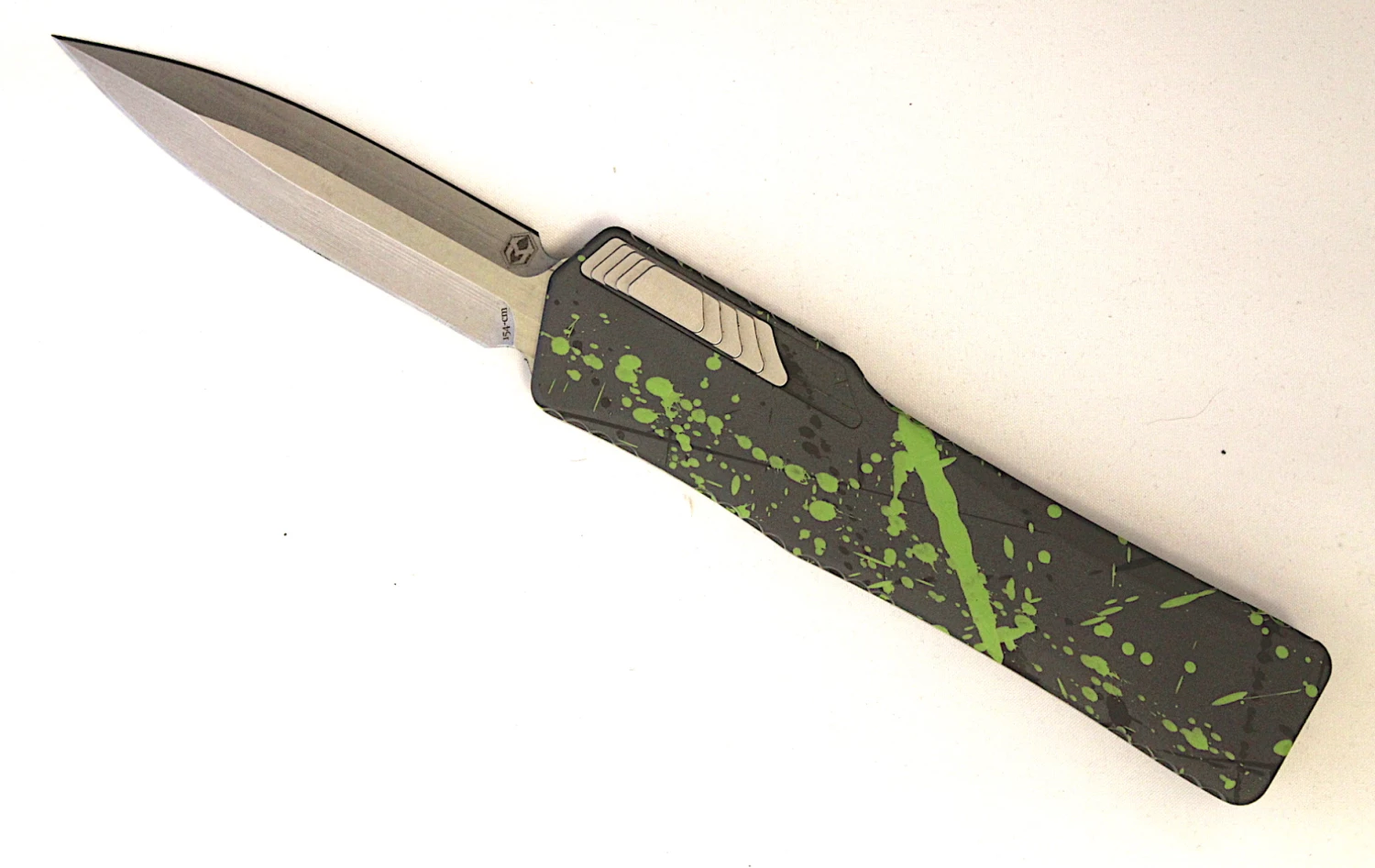 This Cleric OTF automatic has a Black aluminum handle with hand painted Hulk Green Splash (this Green will stay in for years to come they use very durable gunco paint) and a stonewashed blade. It offers a heavy duty build with a clean fit and finish, and a fierce double action automatic opener. The handle has a front loaded thumb slide for ease of use and subtle contouring for a substantial grip. It has compound ground tanto blade and includes a drawstring Heretic Knives pouch.
