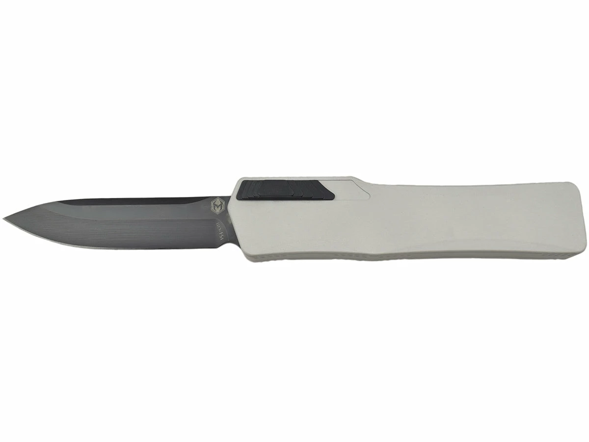 The Heretic Cleric H014-6A-NAT Auto OTF Knife is a hefty knife that features a 154CM steel blade. The clip point blade measures 3.50 in. and has a black finish and a plain cutting edge. The silver aluminum handle provides a comfortable and secure grip and measures 5.25 in. The handle is equipped with a black pocket clip for easy carry. Overall the length of the knife, when open, is 8.75 in. and it weighs approximately 5.36 oz. Made in the USA.