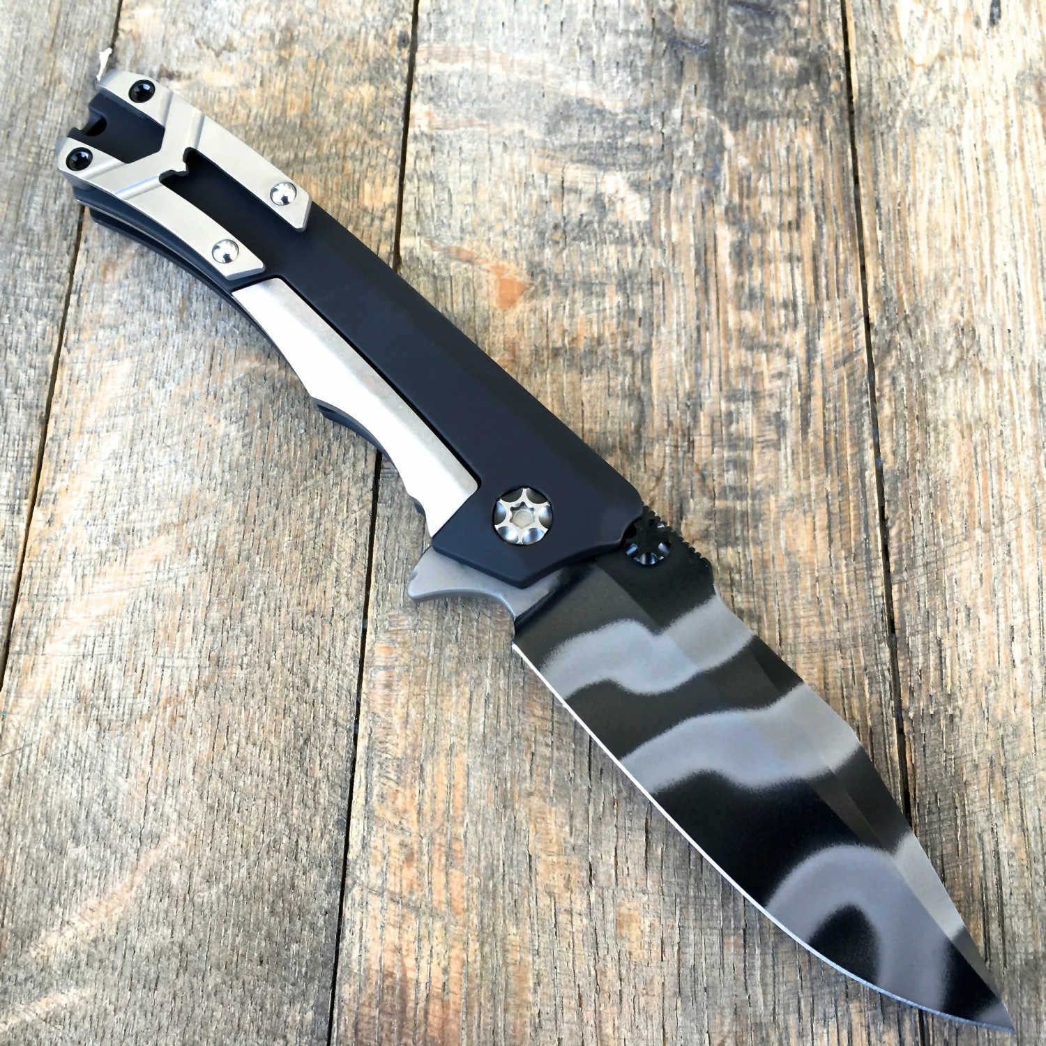 This Wraith by Heretic Knives features a black blade, notched thumbrest and flipper. The handle has a Black aluminum frame with bead blasted stainless steel lockbar and tip up clip with ball bearing insets. The blade is Commando Tiger Striped New from maker.