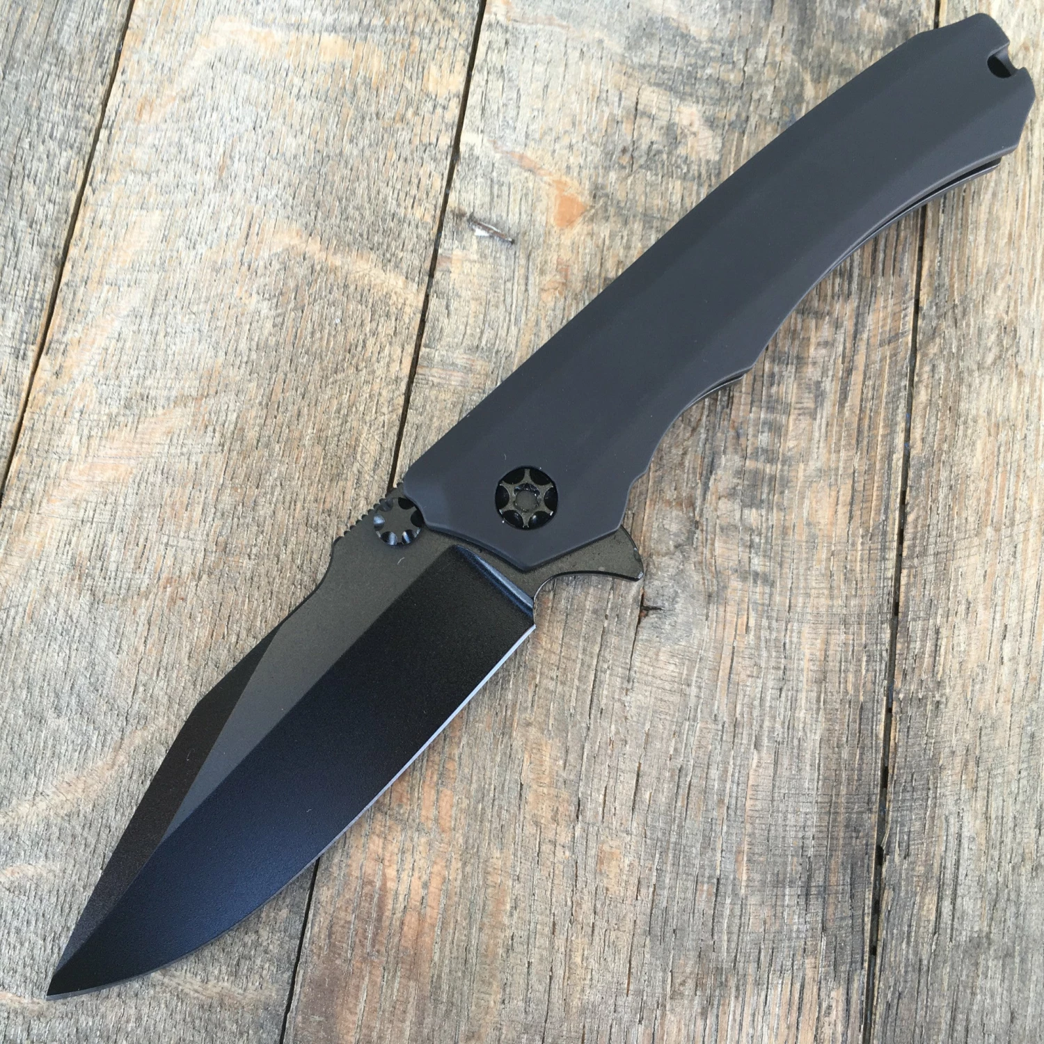 This Wraith by Heretic Knives features a black blade, notched thumbrest and flipper. The handle has a Black aluminum frame with bead blasted stainless steel lockbar and tip up clip with ball bearing insets. New from maker.