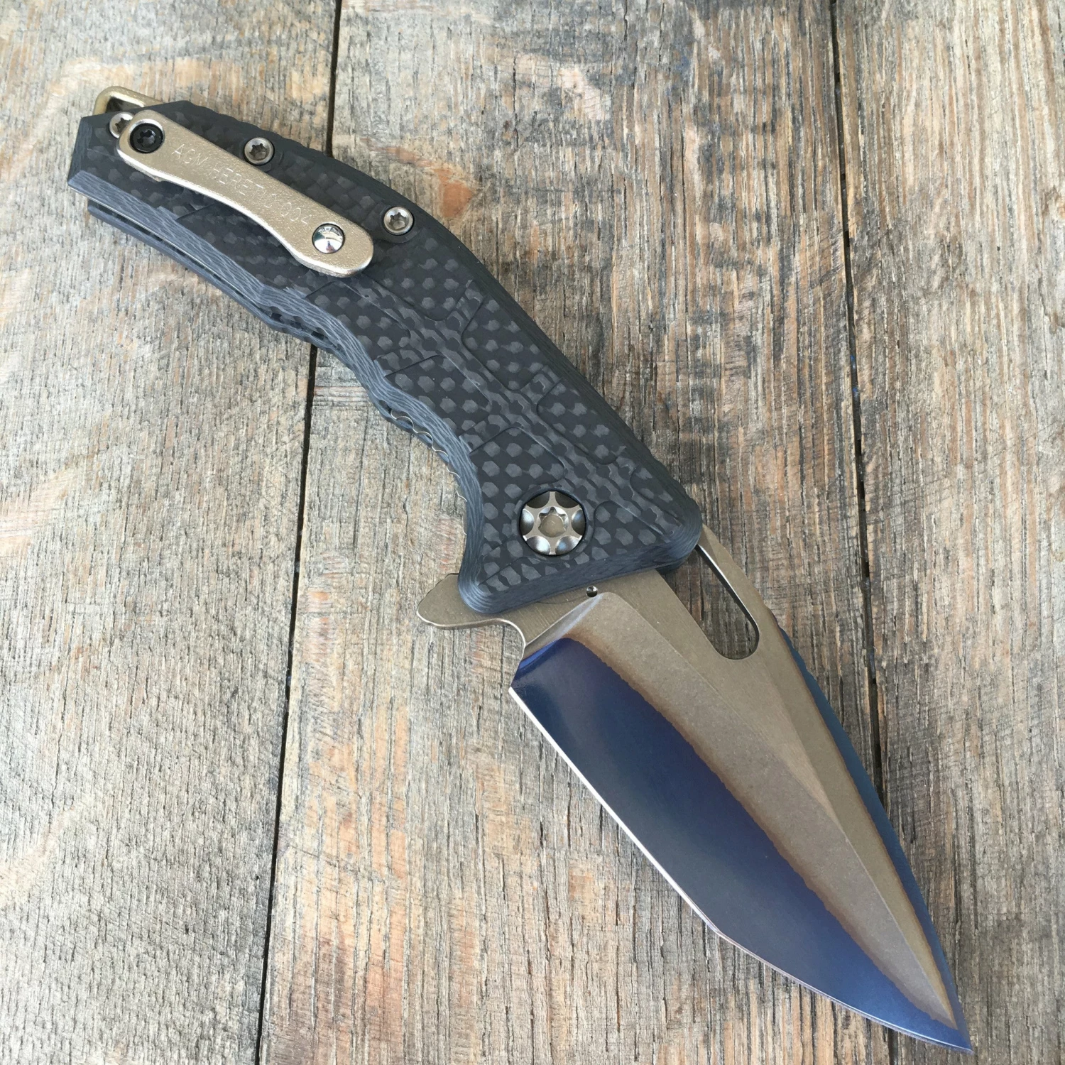 This Custom Martyr by Heretic Knives features a Double Clad (San Mai) steel tanto blade with false top edge, notched thumbrest, thumbhole and flipper. The blade is a gorgeous Bronze and Blue. The handle is solid black carbon fiber frame, stainless steel liner, bronze anodized titanium backspacer and tip up clip, black hardware. Comes with original box and drawstring bag. New from maker Serial #004
