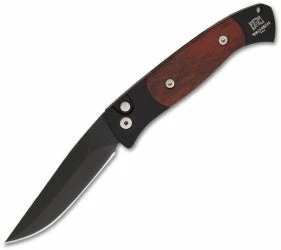 This Brend 2 automatic knife has a black finished 154-CM steel blade and black anodized T6 aluminum body with Cocobolo wood inserts. Satin hardware and black pocket clip.