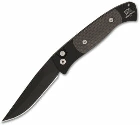 This Brend 2 automatic knife has a black finished 154-CM steel blade and black anodized T6 aluminum body with carbon fiber inserts. Satin hardware and black pocket clip.