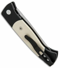 This Tuxedo style Brend 2 automatic knife has a satin finished 154-CM steel blade with a partially serrated edge and a black anodized T6 aluminum body with ivory Micarta inserts, satin hardware and a black deep-carry pocket clip.