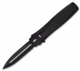 The Dark Angel from Protech is a beautiful knife with a sleek look. This single action out-the-front knife has great action that is quick and controlled. The dagger blade has a double edge and a stone wash finish. The aluminum body is black anodized. The Dark Angel also features a safety for added security and a pocket clip for carry. Includes durable nylon sheath. The Dark Angel is a fine collection piece!
