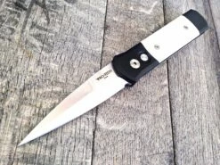 Most people are familiar w/ Pro-Tech’s Godfather knife- big, beautiful and powerful. The Godson is a smaller version of the Godfather. It sports a beautiful satin finished 154-CM blade (plain) and a black anodized T-6 6061 body w/ imitation ivory (polished Micarta) scales. TiNi pocket clip for easy carry. A Pro-Tech classic!