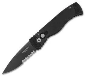 This Tactical Response 2 model features a black coated 154-CM blade with a partially serrated edge and a black anodized T-6 6061 body with areas of engraving to create traction. The Protech TR-2 series is a knife that won’t let you down. It fires hard, locks up like a rock (what else would you expect from Pro-Tech?) and feels great in your hand. The slim design rides well in the pocket and includes a convenient pocket clip for carry.