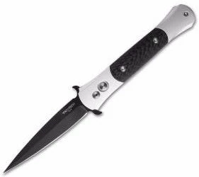 This Don knife features a black finished blade and a satin silver finished aluminum handle with carbon fiber inlays. The firing button and hardware are satin finished. Includes pocket clip.