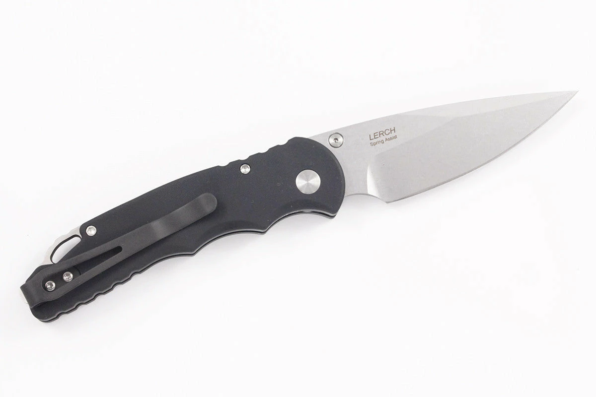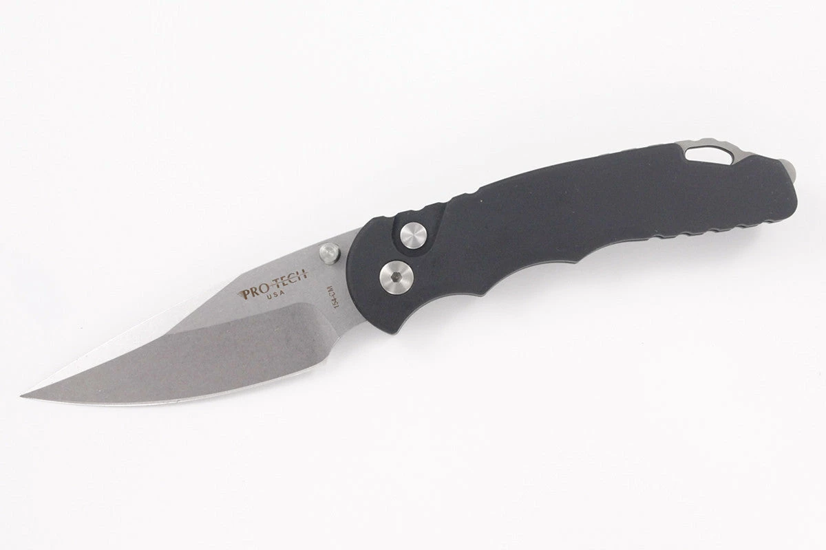 This TR-5 model has a black anodized aluminum handle with a two-tone black back spacer/lanyard attachment, and a deep carry tip-up pocket clip. The blade is stonewashed and outfitted with a thumb stud opener. The plunge lock enables safe use and provides solid lockup. Protech’s TR-5 is an impressive addition to their lineup and boasts their longstanding build-quality and performance.